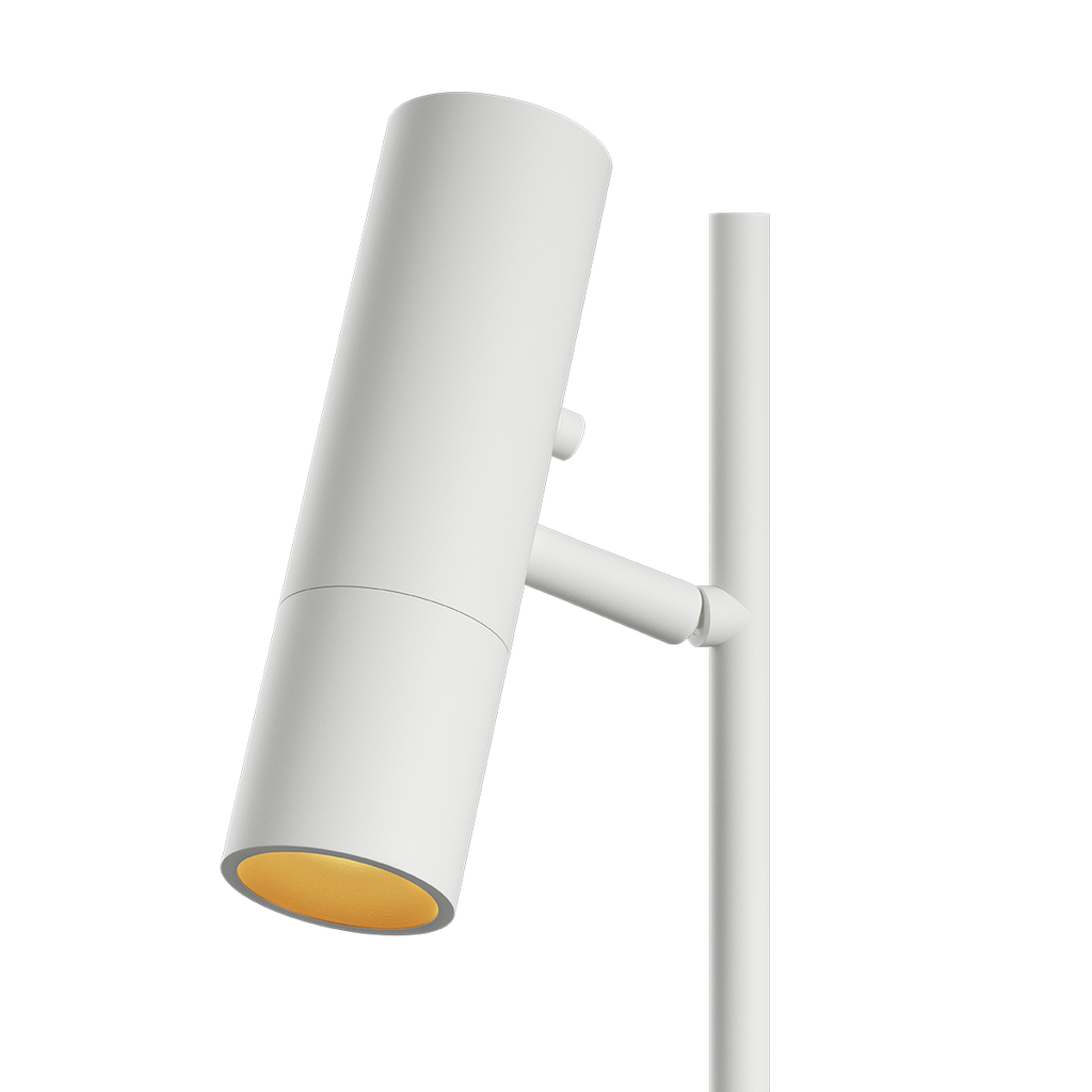 De lichtbron is discreet teruggeplaatst in de kap en zorgt voor verblindingsvrij en comfortabel licht. De goudkleurige binnenzijde reflecteert het licht en voegt een warme toon toe zonder de ruimte te overheersen. Het geïntegreerde kogelgewricht maakt het mogelijk om de lampkop 360 graden te draaien en te kantelen voor gerichte verlichting. De on/off touchknop is subtiel geïntegreerd.