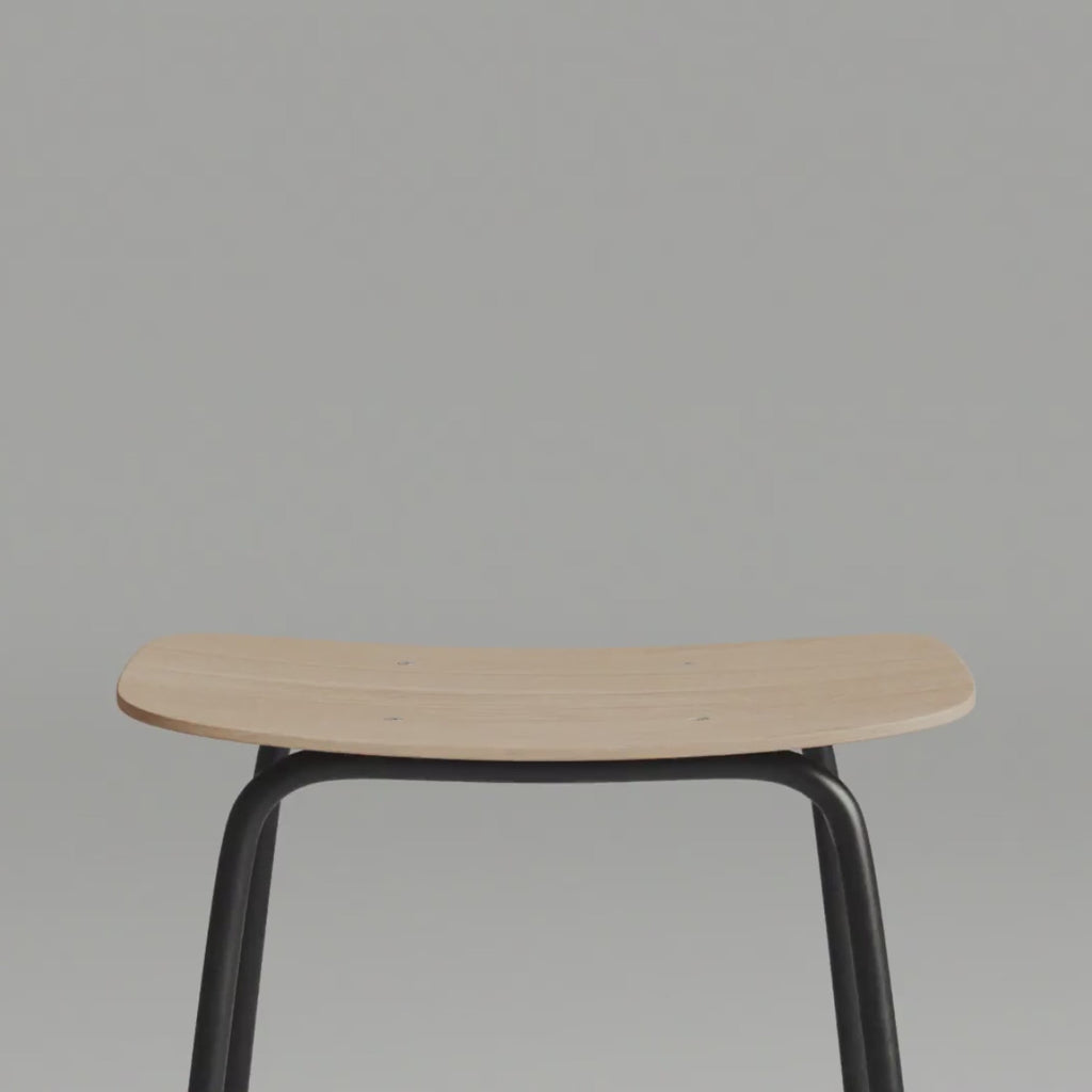 De barkruk is voorzien van een zitting in eikenfineer met een matte afwerking die de natuurlijke structuur van het hout benadrukt. Het frame van gepoedercoat staal voegt een ruwe rand toe en benadrukt de industriële vormentaal.