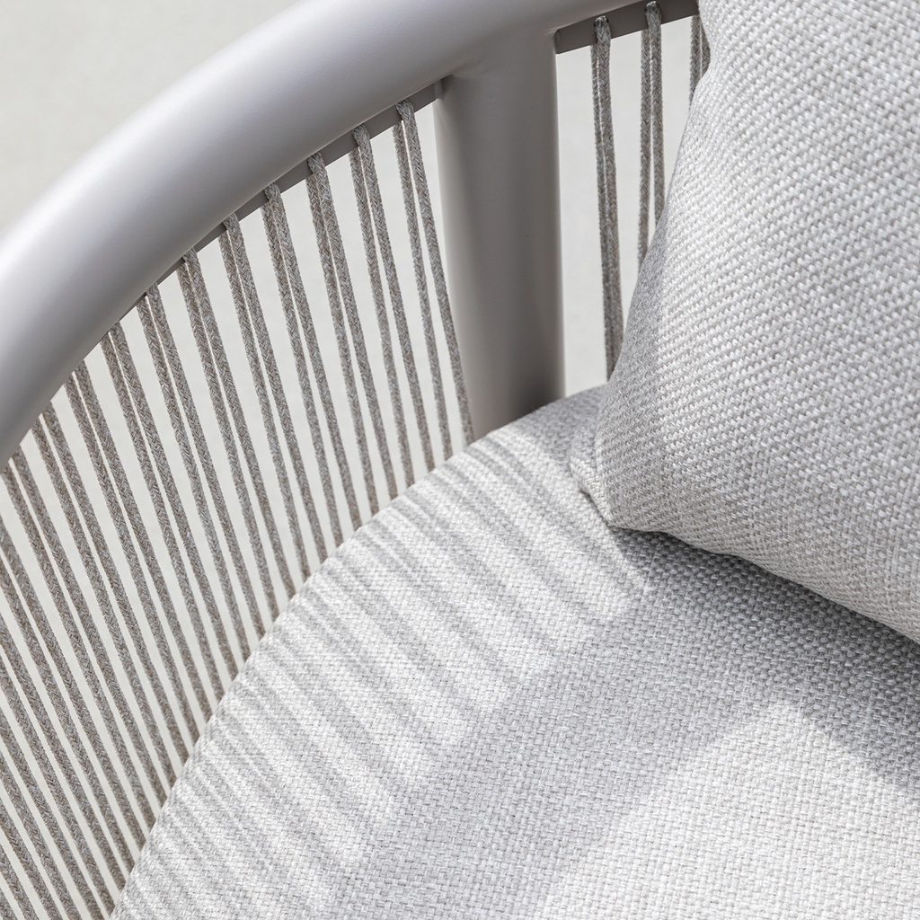 De constructie is opgebouwd rond een gepoedercoat aluminium frame dat niet roest, gecombineerd met slijtvaste textielen met hoge lichtechtheid (7–8). De kussens zijn uitgevoerd met Quick Dry Foam, zodat de sofa snel droogt na regen en het hele jaar buiten kan blijven staan.