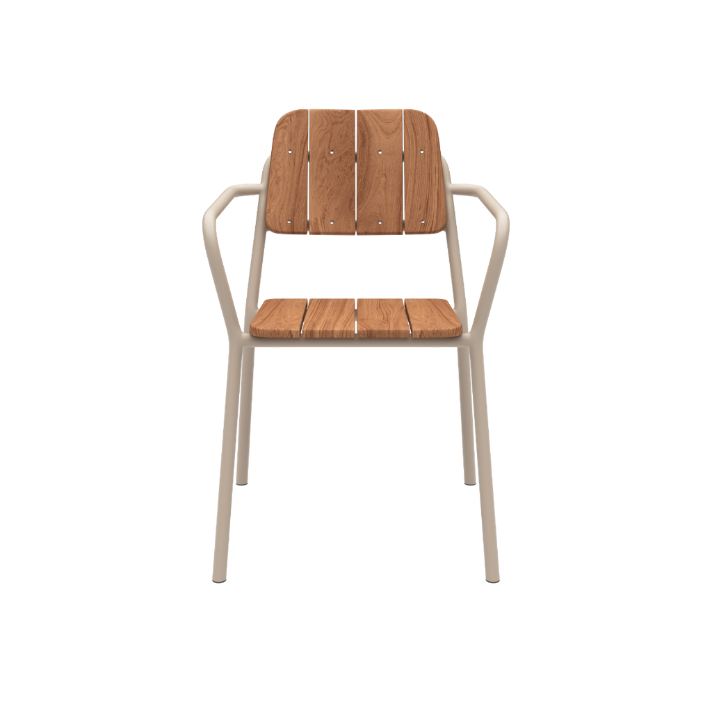 De Kirra Patio Chair is een tuinstoel van gepoedercoat aluminium en FSC®-gecertificeerd teakhout (FSC® C190311). Het lichte aluminium roest niet, terwijl het teakhout warmte en een natuurlijk patina toevoegt.