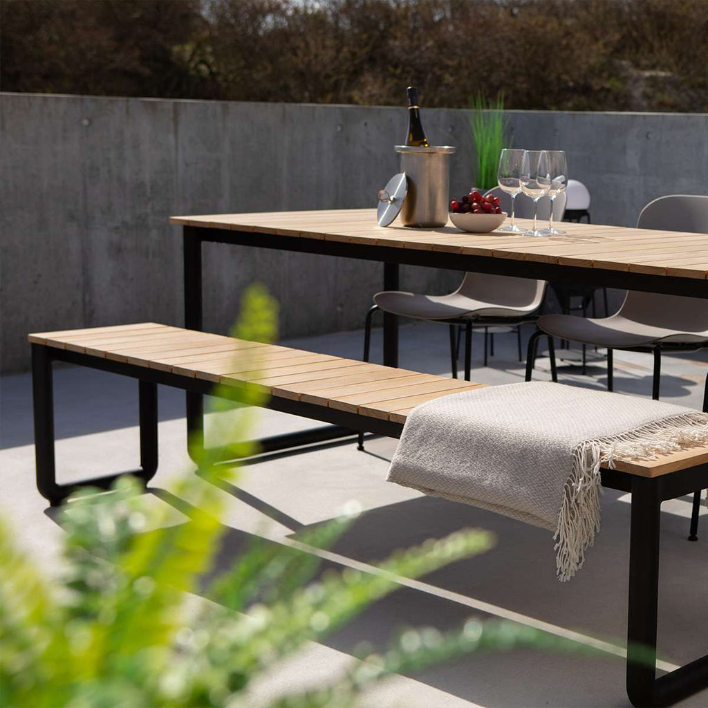 De Patio Bench is een elegante tuinbank, perfect voor elk terras. De bank is gemaakt van powder-coated aluminium met een prachtig zitvlak van FSC®-gecertificeerd teakhout (FSC® C190311). De Patio Bench is een voortzetting van onze Patio Series, maar heeft tegelijkertijd een nieuwe look, waarbij de afgeronde poten het strakke, rechthoekige design verzachten. Gebruik de tuinbank afzonderlijk of combineer hem met de Patio Dining Table - 210x90.