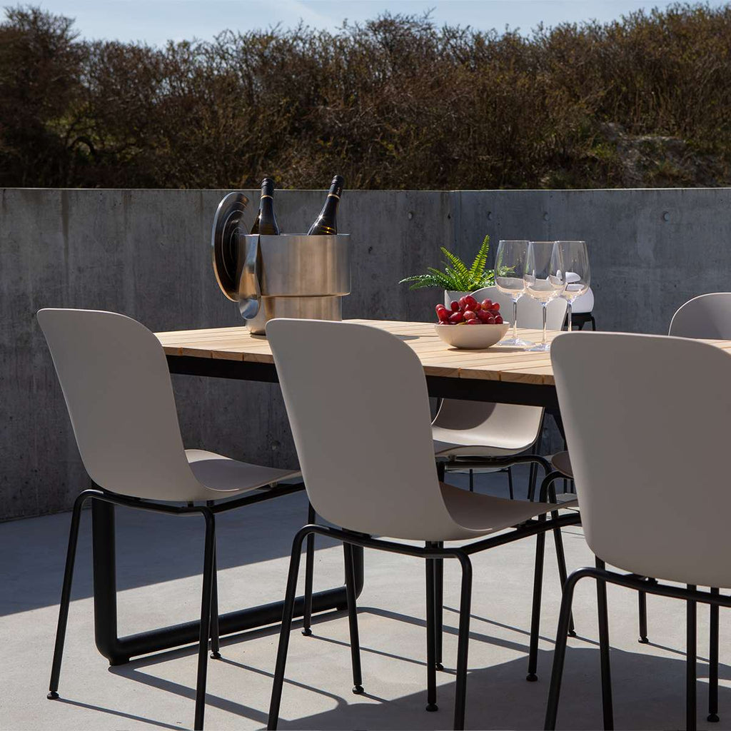 Voor buitengebruik is polypropyleen bijzonder geschikt omdat het geen vocht opneemt en bestand is tegen temperatuurschommelingen en slijtage. Dit maakt de stoelen robuust en stabiel, ook bij langdurig gebruik buitenshuis. Binnen dient polypropyleen als een solide en vormvaste kern die de meubels stevigheid en een lange levensduur geeft, terwijl het ontwerp licht en precies blijft. Voor ons is polypropyleen een doordachte materiaalkeuze waarin functionaliteit, duurzaamheid en design samenkomen. Daarom gebruiken wij voornamelijk gerecycled polypropyleen in onze productie. Al onze meubels worden geleverd met 5 jaar garantie*.