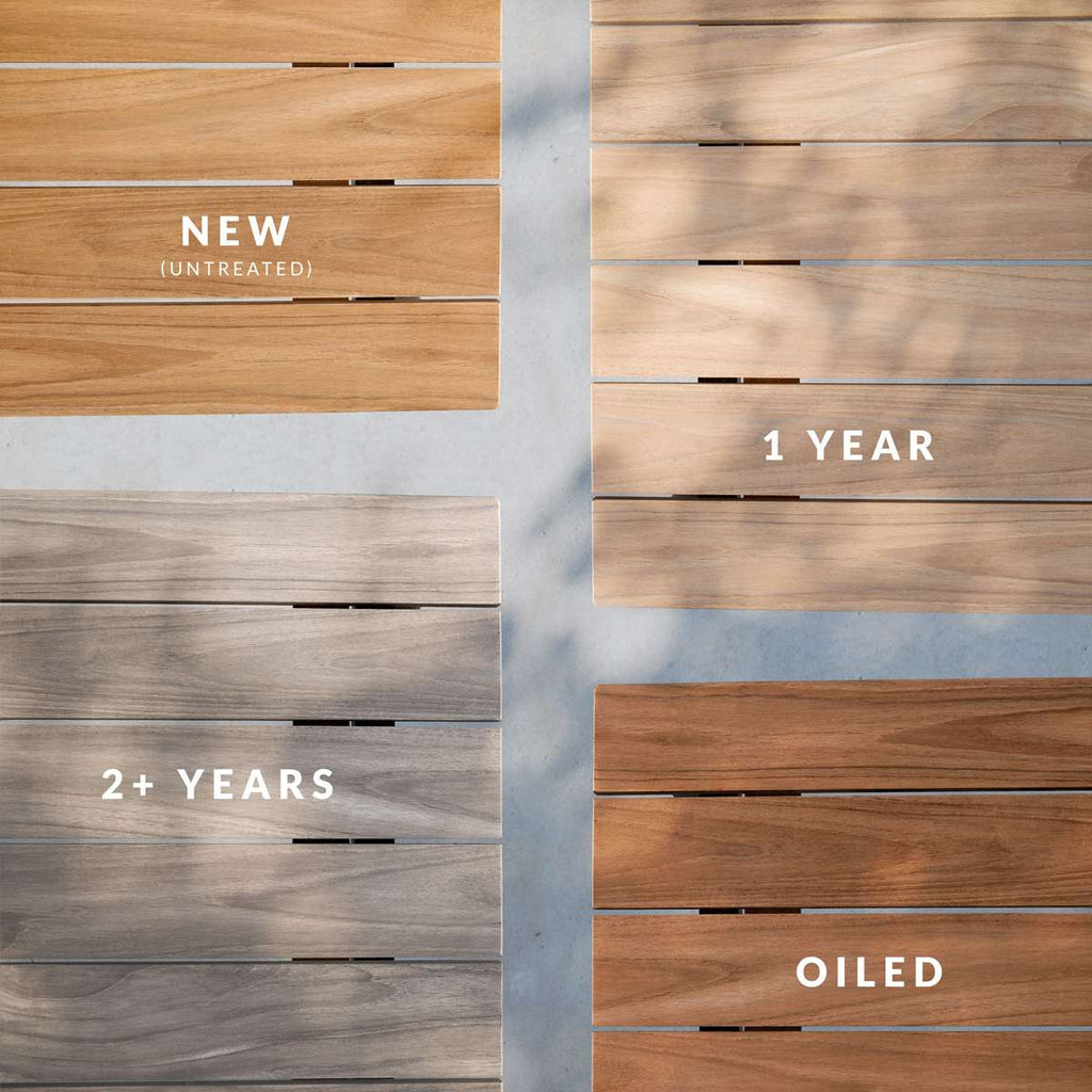 Teakhout kan zelfs zonder behandeling vele jaren meegaan, maar zal na verloop van tijd vergrijzen. Als je de grijze kleur wilt vermijden, moet je de bank regelmatig oliën. Zie onze gids voor teakhout voor verzorging en onderhoud.