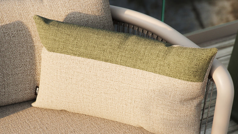 Tide Cushion is gemaakt van Kirra-stof van Sunproof. De stof is slijtvast en waterafstotend – bestand tegen zon, vocht en dagelijks gebruik zonder zijn kleur of vorm te verliezen. De vulling is van polyvezel, wat zachte ondersteuning biedt en het kussen licht en luchtig houdt zonder dat het zijn vorm verliest.